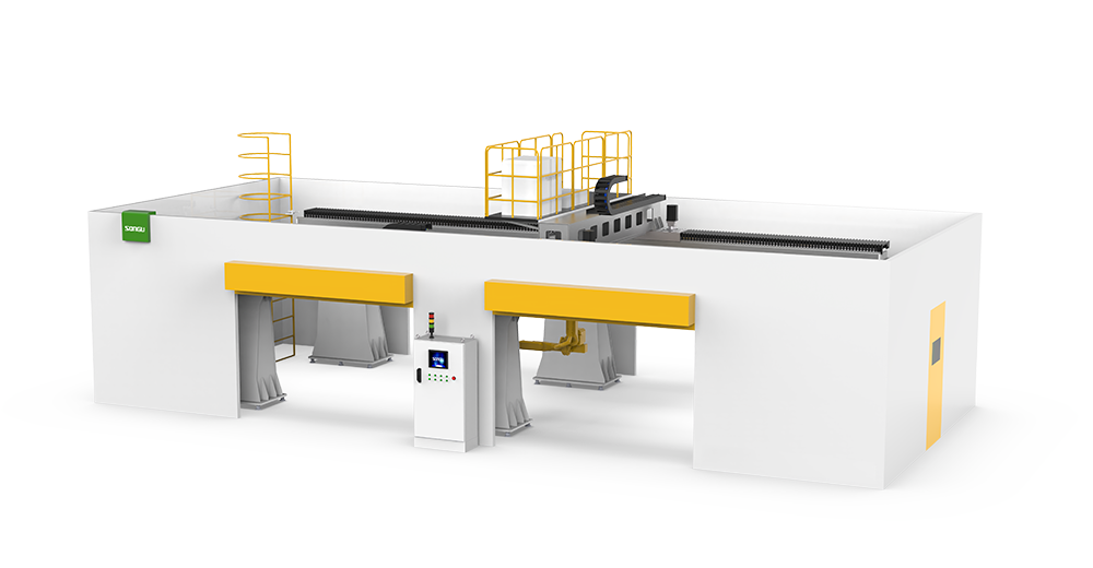 松谷激光科技WMT系列高架龙门三维光纤激光焊接工作站,高精度机器人倒挂式安装,可加工范围大,采用大行程、高刚性龙门结构设计,响应速度快,稳定高效。高性能数控系统,可实现多轴联动控制,可进行多工作空间设定,适用于大型汽车钣金零部件,大型箱体,钣金五金雾部件的焊接,该机型可配置三维切割机型;